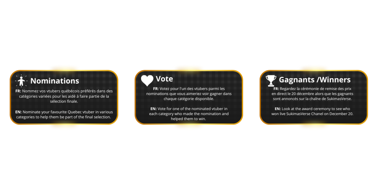 FR: La cérémonie de remise des prix Vtuber Qc mettra en vedette des vtubers québécois de toutes tailles dans de nombreuses catégories, sur toutes les plateformes, en français ou en anglais! On se revoit pour plus d'information sur les Vtuber Awards Qc 2025EN: The Vtuber QC award ceremony will highlight Vtubers from Quebec of all sizes in various categories from various platforms in French or in English. More information will be available on Vtuber Awards Qc 2025.